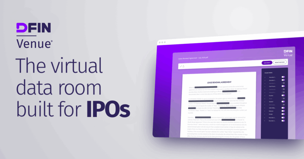 DFINのVenue VDRは、IPOにおけるこうした課題を解決するために設計された、グローバルで信頼されているバーチャルデータルームです。